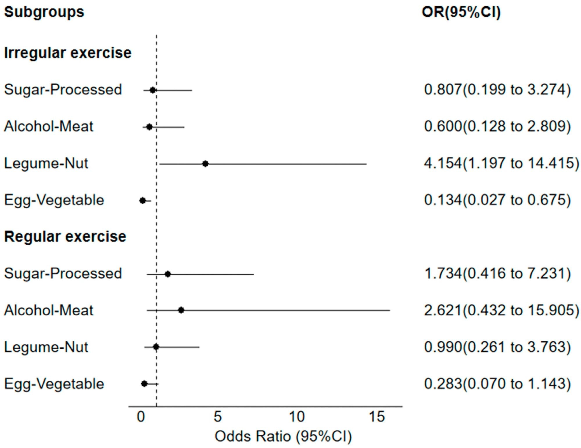 Study participants in the Egg-Vegetable group were older and more likely to be married, drink, and smoke. The individuals in the highest quartile of this group had a 74% reduced risk of metabolic syndrome compared to those in the lowest quartile, particularly among those with irregular physical activity.