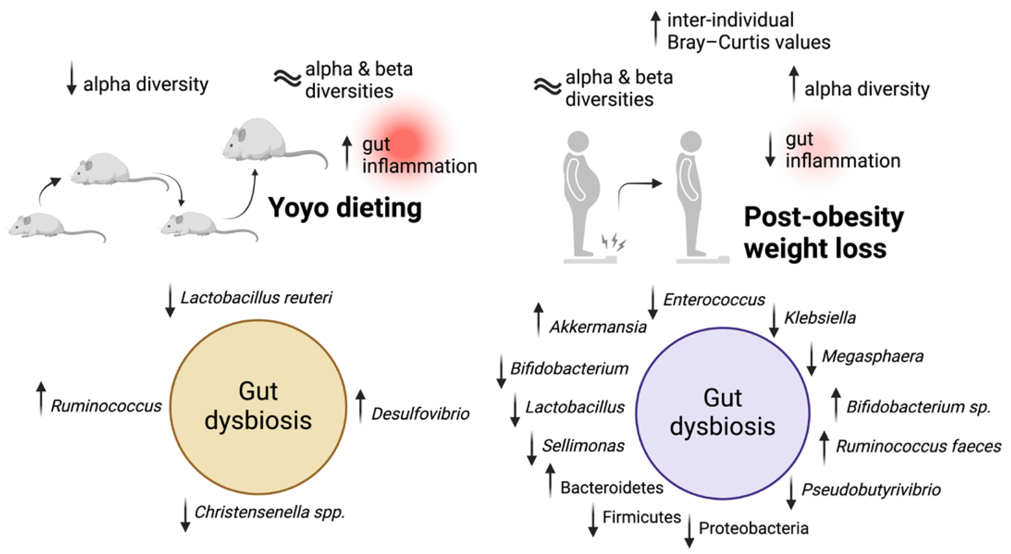 Although yoyo dieting contributes to gut inflammation and dysbiosis, post-obesity weight loss has been shown to improve gut health. Weight loss reduces inflammatory markers in the gut, such as TNF-α and IL-6, and improves intestinal barrier function.