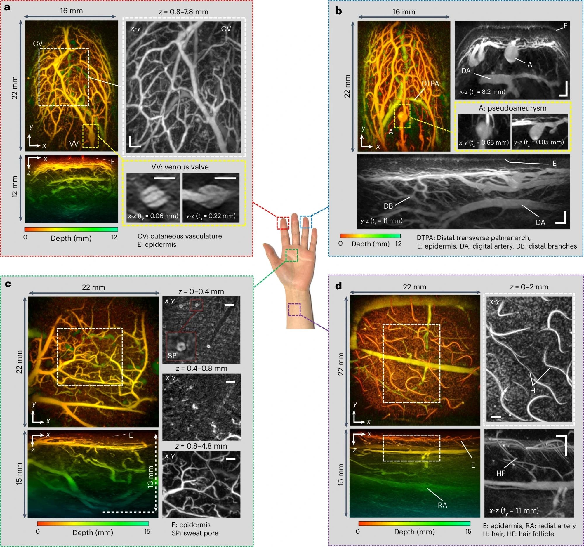 Next, the skin around a raised papule after an insect bite was imaged several times over seven days. On day 1, images revealed a dense, chaotic microvasculature extending from the epidermis to the hypodermis in the papule region. The number of vessels gradually diminished over time. Finally, the team scanned images of the interphalangeal joints of a rheumatoid arthritis patient.
