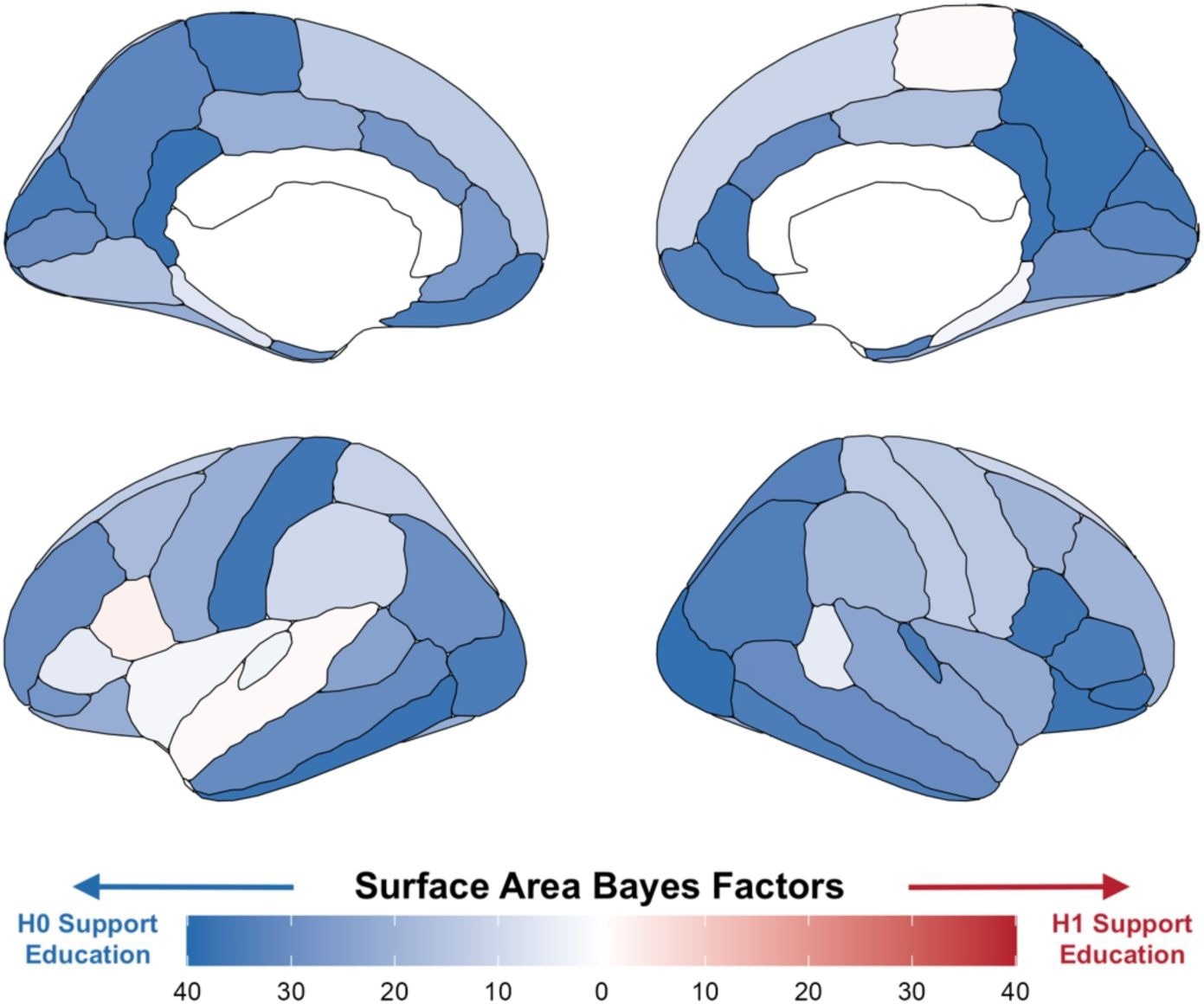 Bayesian analysis showed strong evidence supporting the null hypothesis across all global neuroimaging measures, such as total surface area, cortical thickness, and brain volume. These findings did not change across varying prior distributions, which supports the findings from the initial local-linear RD analysis.
