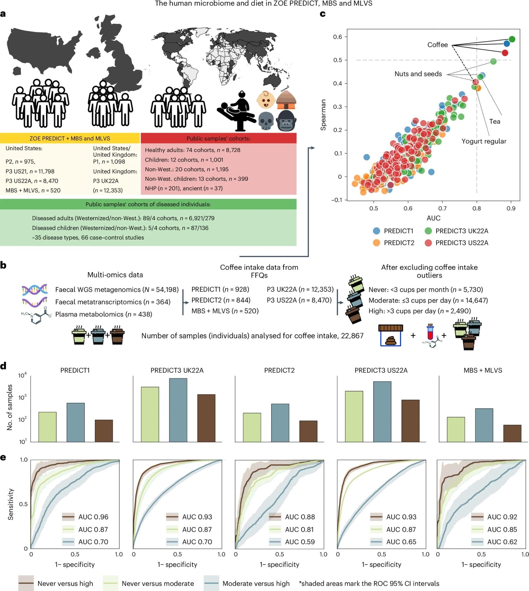a, Five UK and/or US PREDICT cohorts (n = 975, 11,798, 8,470, 1,098, and 12,353), the MBS and the MLVS (n = 213 and n = 307, respectively) were used to assess diet–microbiome relationships (total n = 35,214). For later comparisons of microbiome distributions across different populations, we retrieved n = 18,984 metagenomic samples from public sources, including healthy adult individuals, newborns, non-Westernized (non-West.) individuals, ancient samples, and non-human primates (NHP). P1, PREDICT1; P2, PREDICT2; P3, PREDICT3. b, We combined fecal metagenomics (n = 54,198), fecal metatranscriptomics (n = 364), and plasma metabolomics (n = 438), with the latter two from the MBS and MLVS cohorts. FFQs surveyed the nutritional habits of the participants from four PREDICT cohorts, MBS, and MLVS (n = 22,867 after removing individuals above the 99th percentile of coffee intake in the PREDICT cohorts as outliers). Participants were categorized as ‘high’, ‘moderate’ and ‘never’ coffee drinkers as previously established25. c, Median Spearman’s correlation and median AUCs from a random forest regressor and a random forest classifier trained on the microbiome composition estimated by MetaPhlAn 4 . d, The number of never (light green), moderate (dark cyan) and high-coffee drinkers (brown). e, ROC and AUC of random forest classifiers discriminating participants between pairs of the three coffee drinker classes, assessed in a tenfold, ten times repeated cross-validations (CV) that benefited from the other cohorts during the training phase as in the leave-one-dataset-out approach (LODO). The shaded areas represent the 95% confidence intervals (CIs) of a linear interpolation over all the folds of the test.a, Five UK and/or US PREDICT cohorts (n = 975, 11,798, 8,470, 1,098, and 12,353), the MBS and the MLVS (n = 213 and n = 307, respectively) were used to assess diet–microbiome relationships (total n = 35,214). For later comparisons of microbiome distributions across different populations, we retrieved n = 18,984 metagenomic samples from public sources, including healthy adult individuals, newborns, non-Westernized (non-West.) individuals, ancient samples, and non-human primates (NHP). P1, PREDICT1; P2, PREDICT2; P3, PREDICT3. b, We combined fecal metagenomics (n = 54,198), fecal metatranscriptomics (n = 364), and plasma metabolomics (n = 438) with the latter two from the MBS and MLVS cohorts. FFQs surveyed the nutritional habits of the participants from four PREDICT cohorts, MBS, and MLVS (n = 22,867 after removing individuals above the 99th percentile of coffee intake in the PREDICT cohorts as outliers). Participants were categorized as ‘high’, ‘moderate’ and ‘never’ coffee drinkers as previously established25c, Median Spearman’s correlation and median AUCs from a random forest regressor and a random forest classifier trained on the microbiome composition estimated by MetaPhlAn 4 . d, The number of never (light green), moderate (dark cyan) and high-coffee drinkers (brown). e, ROC and AUC of random forest classifiers discriminating participants between pairs of the three coffee drinker classes, assessed in a tenfold, ten times repeated cross-validations (CV) that benefited from the other cohorts during the training phase as in the leave-one-dataset-out approach (LODO). The shaded areas represent the 95% confidence intervals (CIs) of a linear interpolation over all the folds of the test.