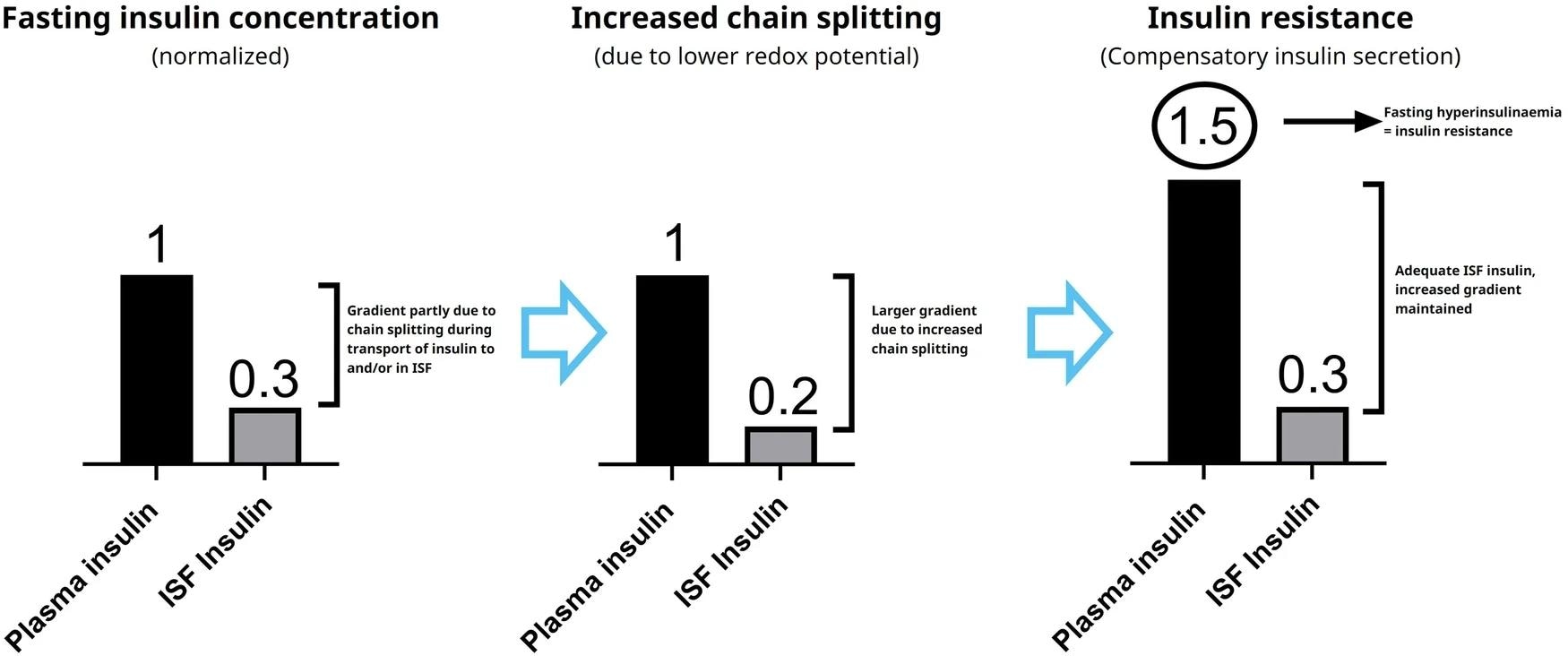 In the present study, researchers hypothesize a novel mechanism of insulin resistance termed ‘chain-splitting.’ The hypothesis posits that the degradation of endogenous insulin during its journey from the pancreas to target cells, not defects in the cells themselves, results in insulin-resistant phenotypes. This hypothesis underscores the role of redox potentials in the plasma environment in driving the chain-splitting process. They use in vitro and in vivo experiments to demonstrate the chain-splitting process across A—and B—insulin chains and substantiate their claims with data from the literature.