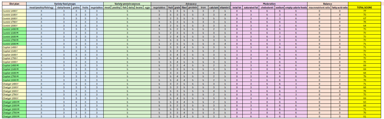 Among different diet quality dimensions, the highest score for food group variety was achieved by meal plans designed by Gemini and Microsoft Copilot. For protein source variety, the highest score was achieved by meal plans designed via Microsoft Copilot and ChatGPT 4.0.