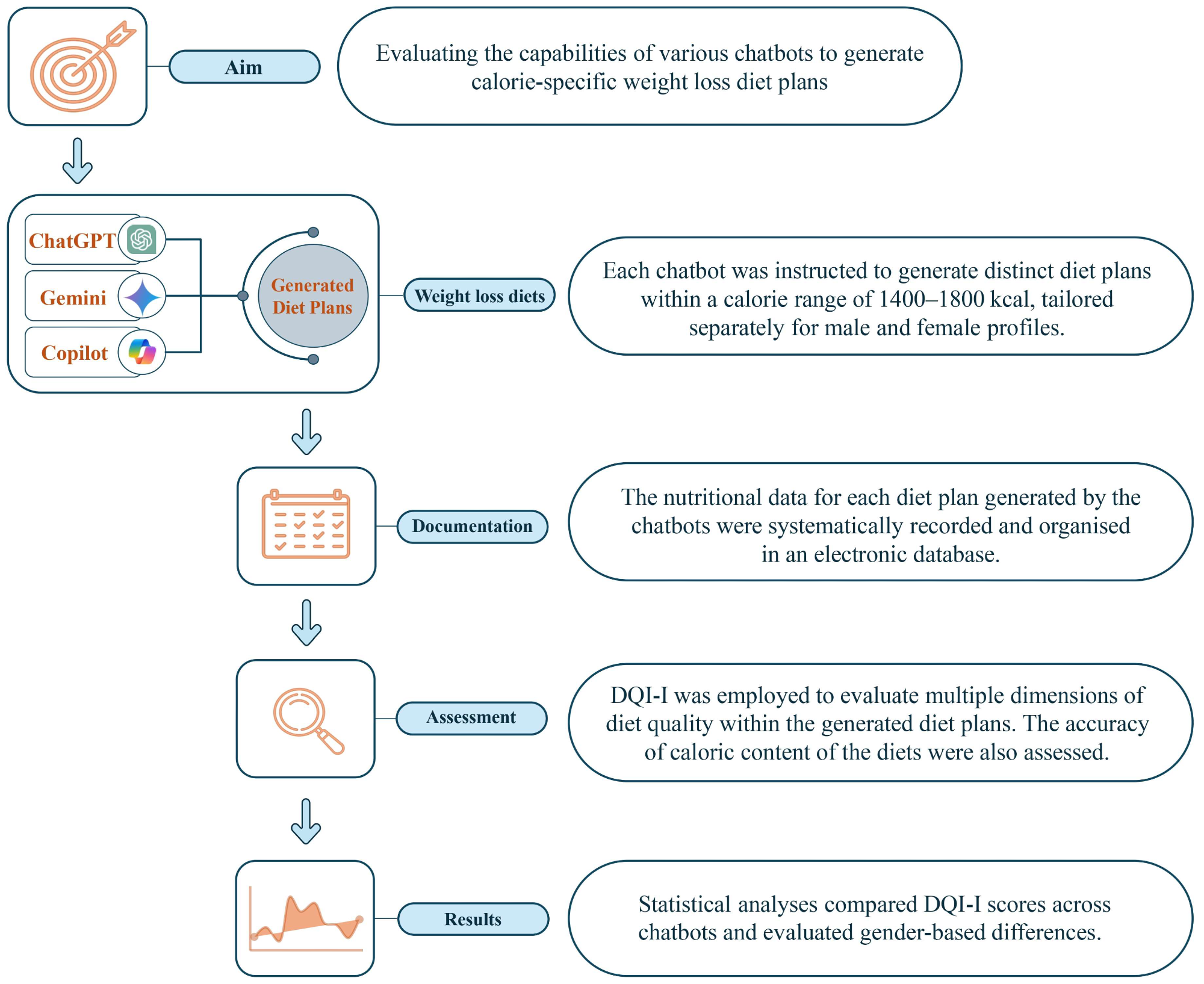 Each chatbot was used to design unique diet plans, customized for male and female profiles, within a calorie range of 1400–1800 kilocalories (kcal) per day.