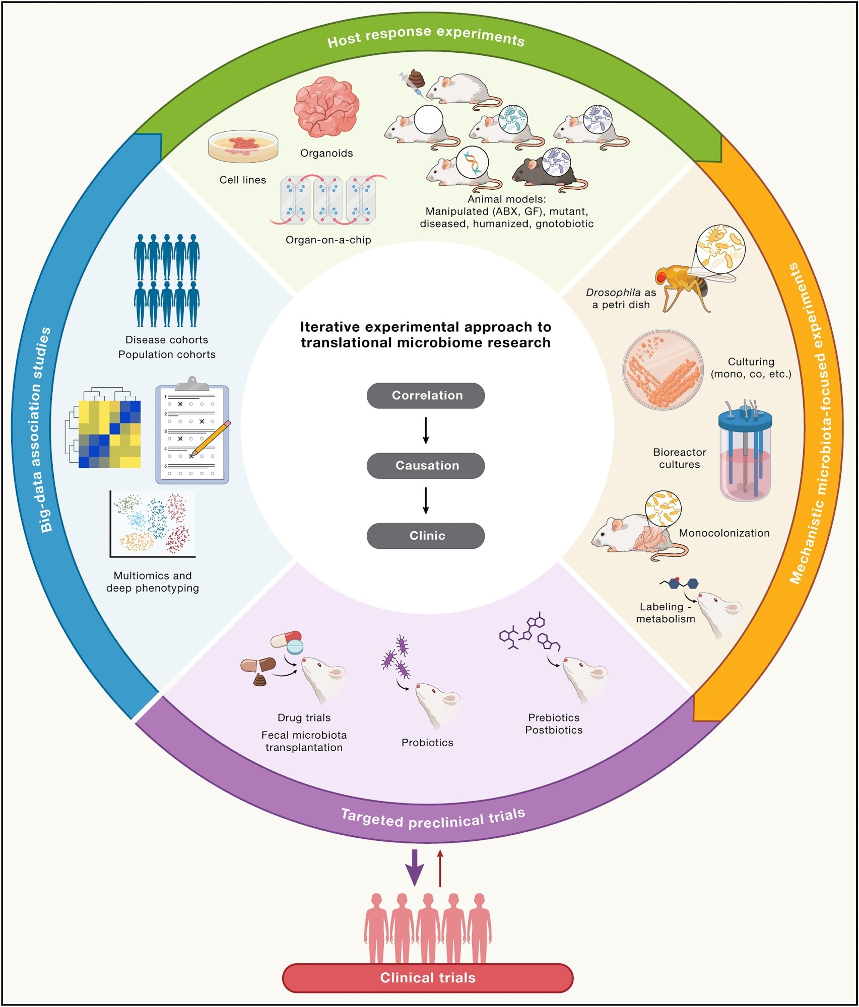 Preclinical trials utilizing host-centric or microbe-centric model systems present a robust platform for proving causation. They have previously been used across medicine and science to elucidate the mechanisms underpinning several diseases, including cancers and immune-mediated disorders, resulting in the development and validation of clinically beneficial drugs and therapeutics.