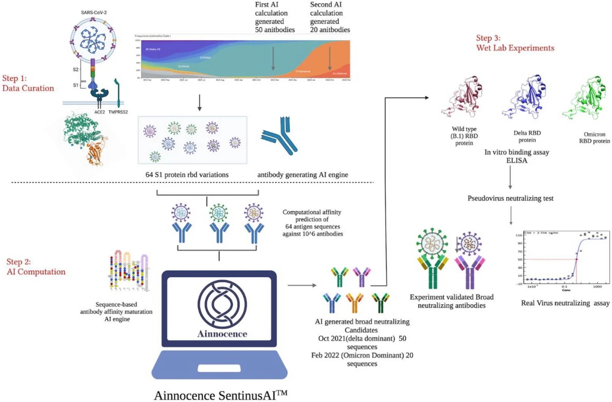 SARS-CoV-2 cross-binding sequence selection and virus mutation data curation. Step 2: AI-based antibody binding prediction and cross-variants binding selection for potential candidate sequences for future variants. Step 3: Measurement of antibody’s binding ability using an ELISA-based assay; and measurement of antibody’s neutralizing capacity using neutralization and cytopathic effect (CPE) reduction assays.SARS-CoV-2 cross-binding sequence selection and virus mutation data curation. Step 2: AI-based antibody binding prediction and cross-variants binding selection for potential candidate sequences for future variants. Step 3: Measurement of antibody’s binding ability using an ELISA-based assay; and measurement of antibody’s neutralizing capacity using neutralization and cytopathic effect (CPE) reduction assays.