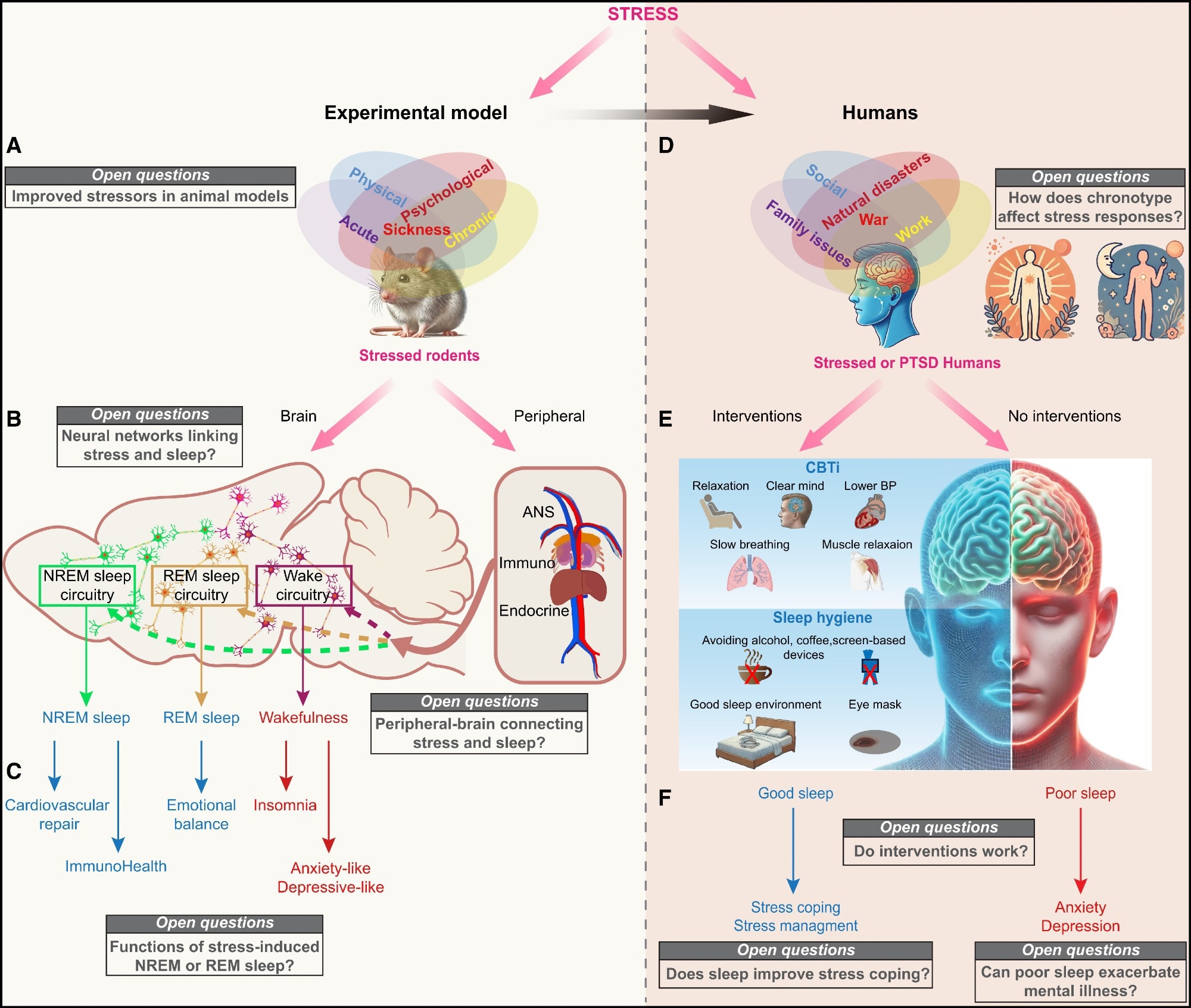 Open questions on stress-induced sleep from rodents to humans (A and B) Perspectives for rodent research. (A) Implementation of diverse stress paradigms: future research should incorporate diverse or combined stress paradigms to address both physical (e.g., injury and hyperthermia) and psychological (e.g., social defeat and unpredictability) stressors. This approach will offer a more comprehensive understanding of how various stress modalities influence sleep architecture, brain states, and behavioral outcomes. (B) Refining circuitry linking stress to brain states: the current understanding of brain-wide and peripheral-to-brain stress architecture remains incomplete. Mapping the interactions between stress-related regions and sleep-wake systems, as well as peripheral-to-brain pathways, will help identify critical hubs and circuits mediating stress responses. Advanced tools such as large-scale imaging, neural tracing, and functional manipulations are essential to elucidate these complex networks. ANS, autonomic nervous system. (C) Elucidating post-stress sleep functions: the functional significance of post-stress NREM and REM sleep remains poorly understood. NREM sleep may promote recovery by reducing autonomic activity and supporting physiological repair, while REM sleep may enhance emotional resilience through processes such as fear extinction and memory reconsolidation. Future studies should focus on delineating the distinct contributions of these sleep stages to stress recovery using integrative methods, including EEG, behavioral assessments, and targeted circuit manipulations. (D and E) Perspectives for human research. (D) The role of chronotype in stress and sleep regulation: an individual’s natural sleep-wake pattern, or chronotype, may influence their vulnerability to stress-induced sleep disturbances or sleep induction. Similarly, stress itself could alter an individual’s biological rhythm, disrupting sleep patterns. Investigating these interactions could help develop personalized interventions aligned with biological rhythms, optimizing sleep quality and stress management outcomes. (E) Targeted interventions to alleviate stress and improve sleep: can enhancing sleep quality serve as a viable intervention for stress? Approaches such as cognitive behavioral therapy for insomnia, improved sleep hygiene, or other evidence-based strategies may improve stress coping mechanisms. Understanding whether better sleep reduces vulnerability to stress-related conditions, including anxiety, depression, or post-traumatic stress disorder (PTSD), remains critical. Conversely, poor sleep following stress may exacerbate these conditions. Defining individualized treatment protocols will be essential for maximizing therapeutic benefits. (F) Sleep as a tool for enhancing stress resilience: if improving sleep quality can mitigate stress and enhance resilience, sleep interventions could become integral to managing chronic stress and preventing stress-related disorders. By prioritizing sleep health, these approaches may significantly reduce the long-term emotional and psychological burden of traumatic or chronic stress.Open questions on stress-induced sleep from rodents to humans (A and B) Perspectives for rodent research. (A) Implementation of diverse stress paradigms: future research should incorporate diverse or combined stress paradigms to address both physical (e.g., injury and hyperthermia) and psychological (e.g., social defeat and unpredictability) stressors. This approach will offer a more comprehensive understanding of how various stress modalities influence sleep architecture, brain states, and behavioral outcomes. (B) Refining circuitry linking stress to brain states: the current understanding of brain-wide and peripheral-to-brain stress architecture remains incomplete. Mapping the interactions between stress-related regions and sleep-wake systems, as well as peripheral-to-brain pathways, will help identify critical hubs and circuits mediating stress responses. Advanced tools such as large-scale imaging, neural tracing, and functional manipulations are essential to elucidate these complex networks. ANS, autonomic nervous system. (C) Elucidating post-stress sleep functions: the functional significance of post-stress NREM and REM sleep remains poorly understood. NREM sleep may promote recovery by reducing autonomic activity and supporting physiological repair, while REM sleep may enhance emotional resilience through processes such as fear extinction and memory reconsolidation. Future studies should focus on delineating the distinct contributions of these sleep stages to stress recovery using integrative methods, including EEG, behavioral assessments, and targeted circuit manipulations. (D and E) Perspectives for human research. (D) The role of chronotype in stress and sleep regulation: an individual’s natural sleep-wake pattern, or chronotype, may influence their vulnerability to stress-induced sleep disturbances or sleep induction. Similarly, stress itself could alter an individual’s biological rhythm, disrupting sleep patterns. Investigating these interactions could help develop personalized interventions aligned with biological rhythms, optimizing sleep quality and stress management outcomes. (E) Targeted interventions to alleviate stress and improve sleep: can enhancing sleep quality serve as a viable intervention for stress? Approaches such as cognitive behavioral therapy for insomnia, improved sleep hygiene, or other evidence-based strategies may improve stress coping mechanisms. Understanding whether better sleep reduces vulnerability to stress-related conditions, including anxiety, depression, or post-traumatic stress disorder (PTSD), remains critical. Conversely, poor sleep following stress may exacerbate these conditions. Defining individualized treatment protocols will be essential for maximizing therapeutic benefits. (F) Sleep as a tool for enhancing stress resilience: if im