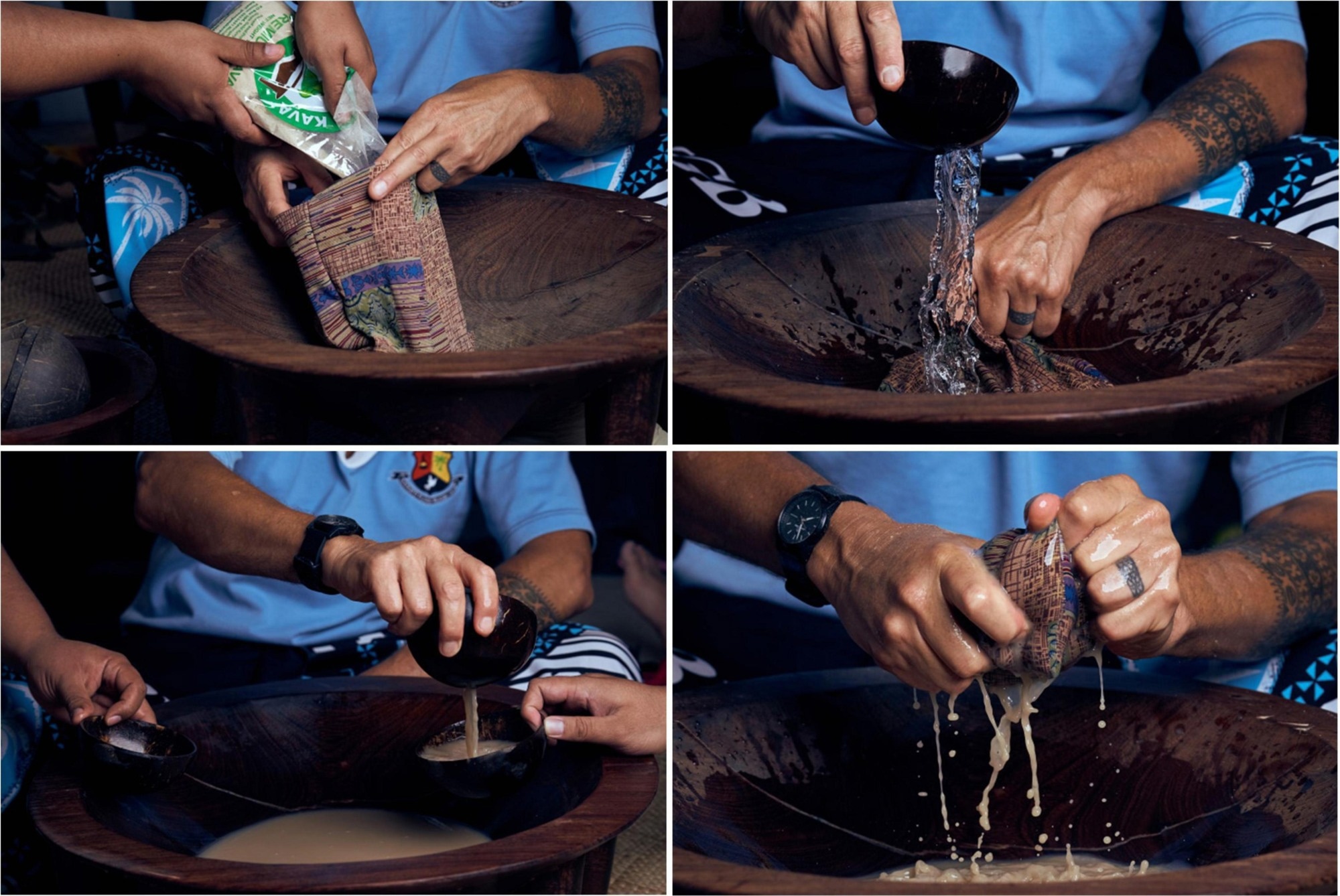 Kava mixing and serving in Tāmaki Makaurau Auckland, Aotearoa New Zealand. Clockwise: 1. dried and pounded kava powder is added to the silk mixing bag; 2. water is added to the tanoa or kumete (traditional kava bowl); 3. the kava (in the mixing bag) is washed through the water until the desired concentration is achieved; 4. the kava is served in ipu/bilo (cups made from half-coconut shells). Photographer: Todd M. Henry, 2019.Kava mixing and serving in Tāmaki Makaurau Auckland, Aotearoa New Zealand. Clockwise: 1. dried and pounded kava powder is added to the silk mixing bag; 2. water is added to the tanoa or kumete (traditional kava bowl); 3. the kava (in the mixing bag) is washed through the water until the desired concentration is achieved; 4. the kava is served in ipu/bilo (cups made from half-coconut shells). Photographer: Todd M. Henry, 2019.