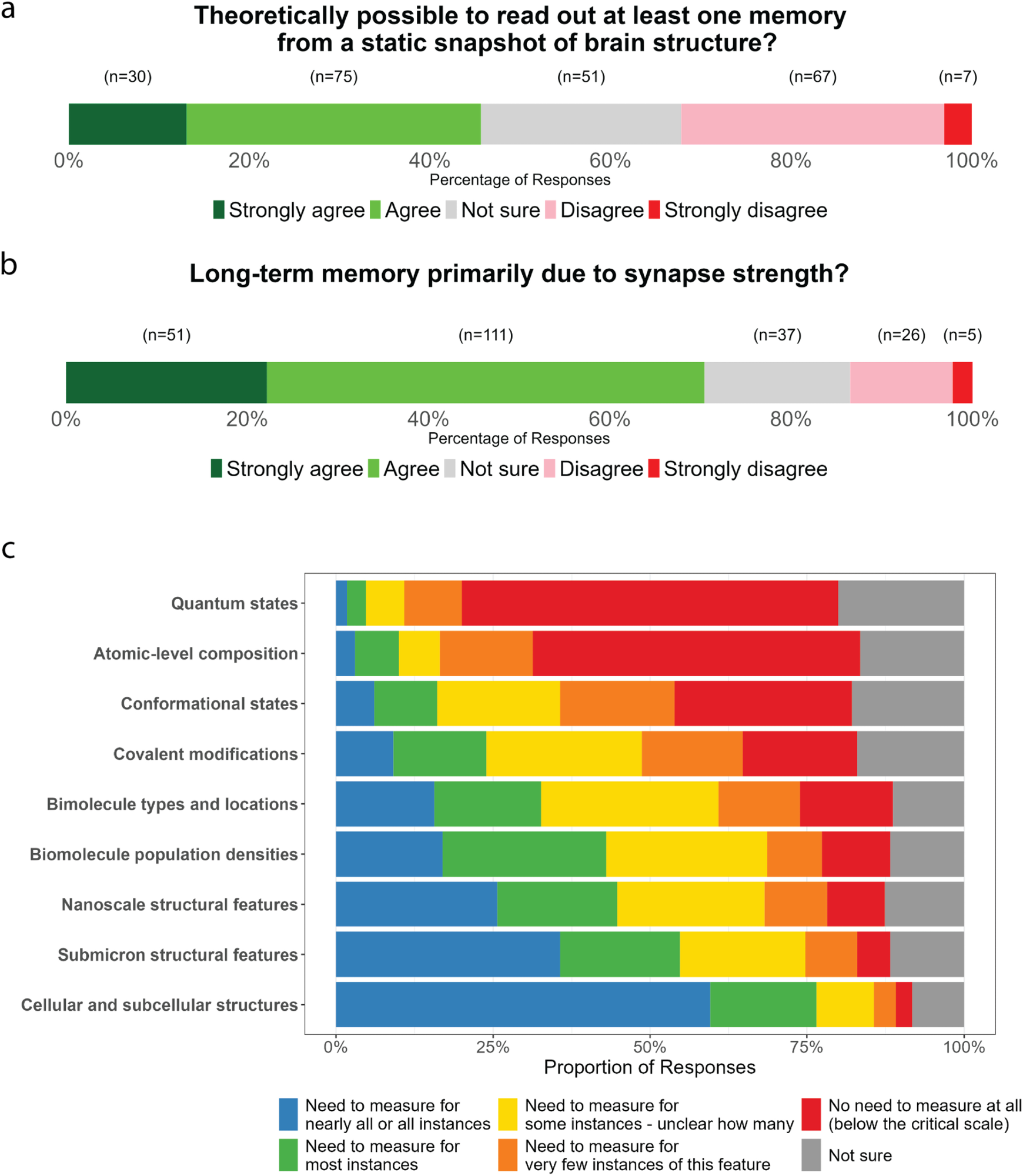 Beliefs about the physical basis of memory. a) Responses to the question ‘To what extent do you agree with the following statement: “Given the scientific knowledge assumed in Point A existed, it would be theoretically possible to read out the information corresponding to at least one specific non-trivial memory from a static snapshot of the structure (including biomolecules) of an organism's entire brain.” b) Responses to the question ‘Some neuroscientists have suggested that, while molecular and subcellular details play a role, the majority of information for long-term memories is likely physically stored in the brain at the level of neuronal connectivity patterns and ensembles of synaptic strengths (e.g., Poo et al., 2016). To what extent do you agree with the following statement: “The structural basis of long-term memories primarily consists of lasting changes in neuronal connectivity and ensembles of synaptic strengths, rather than in molecular or subcellular details.” c) Participants’ views on the critical scale for memory encoding in the brain.