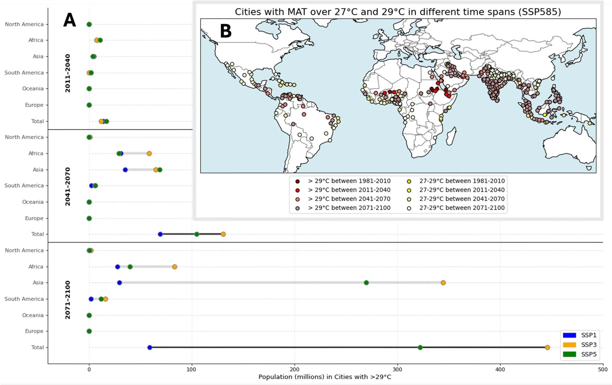Seventeen cities had a MAT above 29 °C for 2011-40. This number was projected to increase to 57 by 2041-70 and 217 by 2071-2100. The projected population of cities above 29 °C was estimated to be 320 million people between 2071 and 2100, with the majority residing in Asia (270 million), followed by Africa (40 million) and South America (12 million). Under SSP1-2.6, the most favorable scenario, over 59 million people were projected to live in cities with a MAT > 29 °C.
