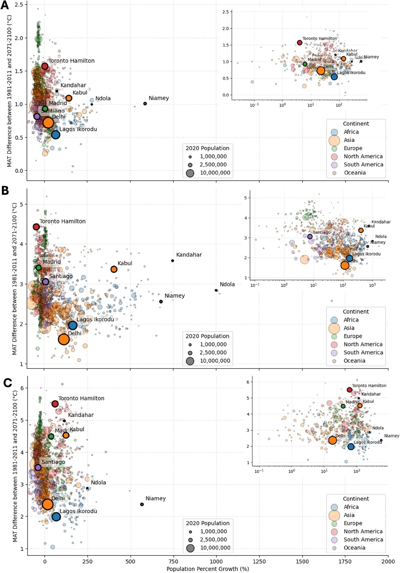 Differences in mean annual temperature and relation to urban growth. (A) Distribution of cities based on the difference in MAT and the population growth in linear and in the small plot on a logarithmic scale for SSP1-2.6, (B) SSP3-7.0 and (C) SSP5-8.5. The figures were created using the code that can be found in the repository, as stated in the code availability statement.