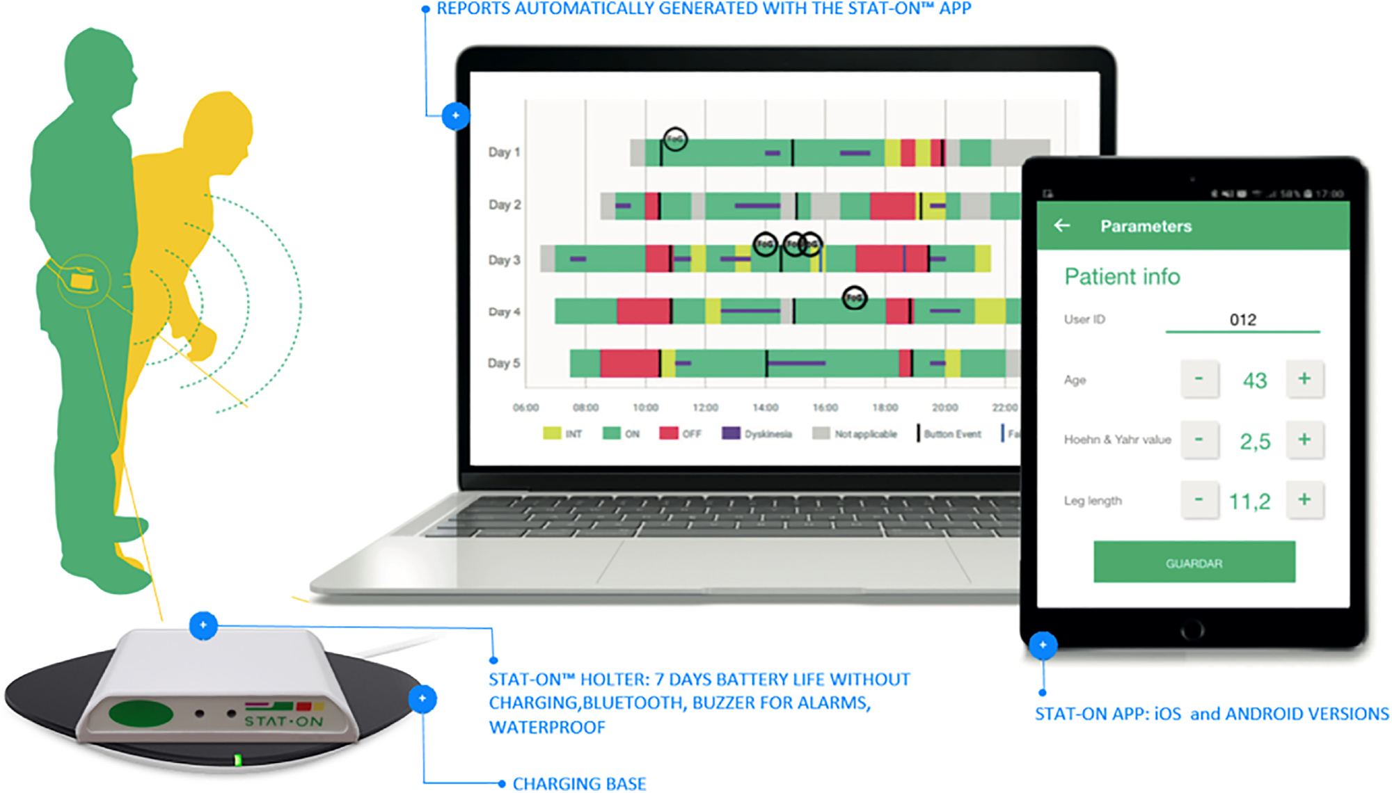 STAT-ON™ is an artificial intelligence (AI)-powered waist-worn medical device that monitors PD-related motor symptoms during daily activities. It also provides information about patient’s medication intake.