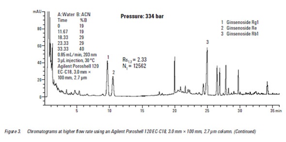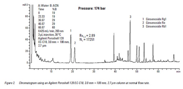 To summarize, there was substantial time saving without compromising resolution when ginsenosides were analyzed from ginseng using Poroshell 120 columns instead of traditional 4.6 X 150mm, 5µm columns.