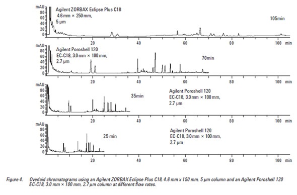For the experiment the Agilent Poroshell 120 2.7 μm columns were packed with porous materials to achieve a faster separation while maintaining the linear velocity of the analyte within the column.