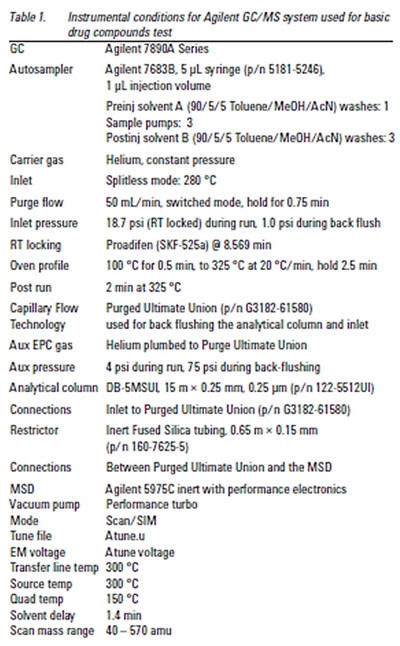 The Ultra Inert liners from Agilent with its thorough glass wool deactivation process can improve the efficacy and repeatability of the experiment significantly. This is the first time that liners containing glass wool are capable of analyzing basic drugs of abuse using the GC/MS.