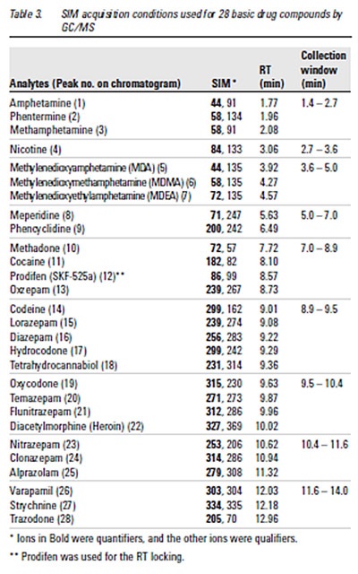 For the experiment the standard 28 drug mix of forensic/toxicology check mix was used. The compounds in the mix contained both early and late retention rates and contained different categories of compounds such as alkaloids, amphetamines and benzodiazepines.