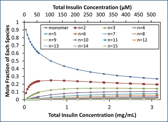 Using the self-association model, the equilibrium distribution of oligomers can be determined (Figure 4). As the total concentration reaches the isodesmic binding site affinity, the self-association of insulin molecules occurs and the monomer fraction in the solution quickly decreases. At concentrations over ~0.6 mg/mL (~100 µM), even the dimer fraction reduces as oligomers of a higher order start to form.