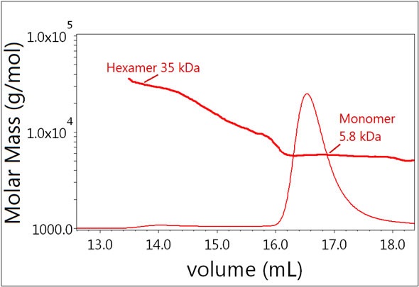Multi-angle light scattering (MALS) is one of the main methods used to measure the molar mass of macromolecules in solution. This method does not make any assumptions about the structure of the molecule and eliminates the need for molar mass standards. Previously, studies have demonstrated the separation of oligomers using SEC and their detection has been achieved using light scattering methods. In addition, composition-gradient MALS (CG-MALS) measurements have been used to ascertain the stochiometry and affinity of insulin association.