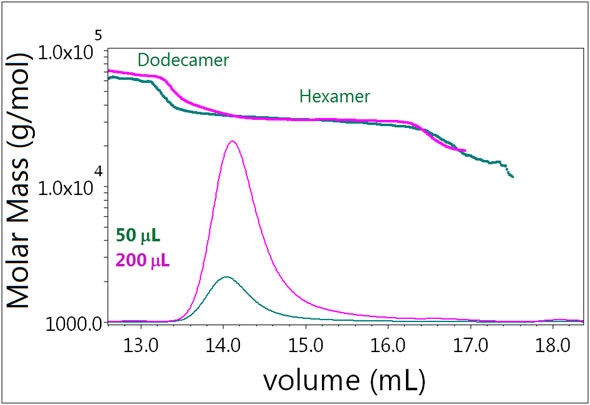 SEC-MALS enables the strength of a reversible self-association to be assessed. When the volume injected on the column is increased, the overall protein concentration also increases as it moves through the detectors, which shifts the equilibrium of the eluent toward the oligomeric complexes. In Samples 2 and 3, any changes in equilibrium association were examined by injecting 50 µL or 200 μL of the same sample solution onto the SEC column.