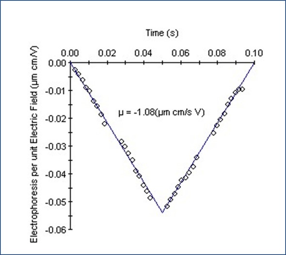 Figure 2 shows a typical ‘V-graph’ for the electrophoretic mobility measurement. The data denotes the average of 300 electric field oscillations multiplexed across 30 detectors.