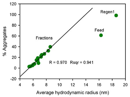 The quantified Rh value of the regeneration sample is 18.6 nm, which is greater than the value of the feed sample, at 16.3 nm, which suggest that the HMW population is higher than in the feed sample. The plotting of the percentage of aggregates obtained by SEC-MALS against the average Rh ascertained by DLS (Figure 1) showed an excellent correlation for the flow-through fractions.