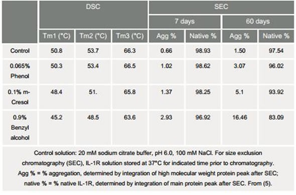 Table 3. Effects of preservatives on IL-1R: Comparison of Tm and size exclusion Chromatography