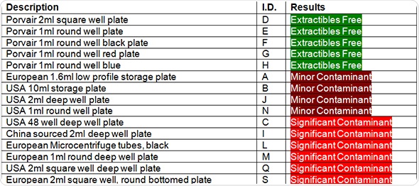 It can be concluded from the results that despite the availability of good quality medical-grade polypropylene for deep well microplate production, over 50% of the tested plates showed some form of contamination, usually caused by extractable compounds leaking from the plastic.