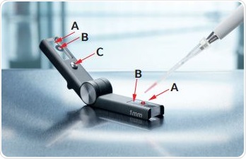 The Eppendorf µCuvette, shown in Figure 2, was developed based on the measurement principle decribed above. It can be seen that the µCuvette is made up of two arms with a small quartz plate fitted at the end of each arm. The sample application area is demarcated by two black markings at the end of the arms for easy sample application.