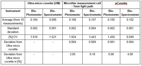 It can be seen from the µCuvette results that the values were in line with the expected results, and also with the measurements acquired with the ultra-micro cuvette. This means that the µCuvette has a lower deviation when compared to a competing microliter measurement cell. Such low standard deviations imply that the µCuvette can provide a high degree of precision in measurements.