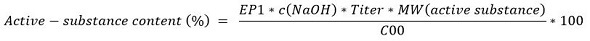 Where, EP1 is titrant consumption up to endpoint in mL; c(NaOH) is concentration of NaOH titrant in mol/L; titer of NaOH titrant (no unit); MW(active substance) molecular weight of active substance in g/mol; and C00 sample weight in mg.