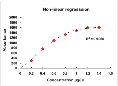 Figure 4. Standard curve with non-linear regression. Possible shape of a Bradford standard curve