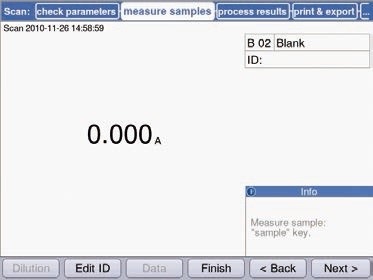 On establishment of the standard curve, initiation of sample measurement takes place immediately. The “Next” soft key directly leads to the area of measurement. Figure 12 shows an example of a sample measurement. The resulting measurement of the sample is directly displayed within the curve’s standard in Figure 12. This shows the range of standards selected coherently for sample determination.