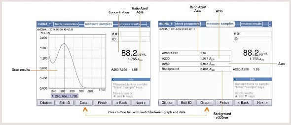 The results measured for a sample of nucleic acid are analyzed using the Eppendorf BioSpectrometer® and Eppendorf BioPhotometer®D30. Before measuring, it is mandatory that the right parameters for evaluation are set. Using the Eppendorf BioSpectrometer and the Eppendorf BioPhotometer, these criteria can be directly edited before taking measurements (Figure 3). Figure 4 shows the measuring result of a nucleic acid using the Eppendorf BioSpectrometer or BioPhotometer D30.