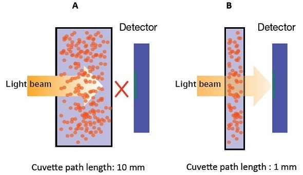- A cuvette having a shorter optical path length should be used: At high concentrations, the UVette can be turned using a path length of 2mm (Figure 5), or alternatively μCuvette G1.0 with path length of 1mm can be used (Figure 6). The principle to reduce the path length measurement is elaborated in Figure 7.