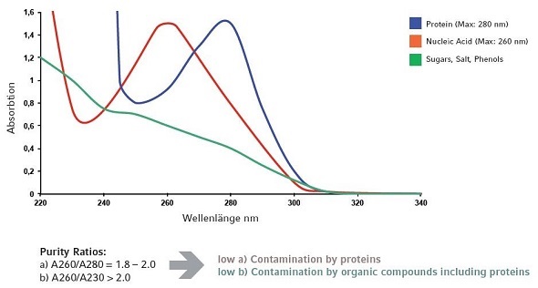 By determining the absorbance at 230nm and 260nm, the A260/A230 ratio can be evaluated. This ratio must be >2.0.
