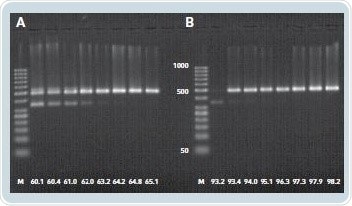 Examination of the other gradient run showed that non-precise products were formed at a lower denaturation temperature of about 93°C (Figure 3). At temperatures more than this level, only the specific product connected with a larger yield was noticed. Therefore, the appropriate future denaturation temperature was found to be 97°C.