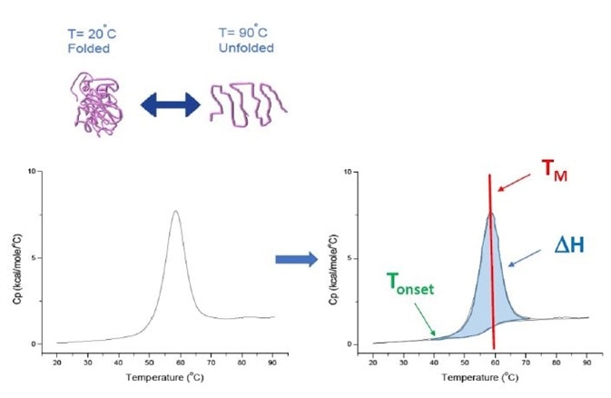 ΔCp, T1/2, Enthalpy (ΔH), and Tonset from DSC are also employed in rank-ordering stability, quantitative analysis of protein unfolding, validation of DSC data, and higher order structure 'fingerprinting'[10-14].