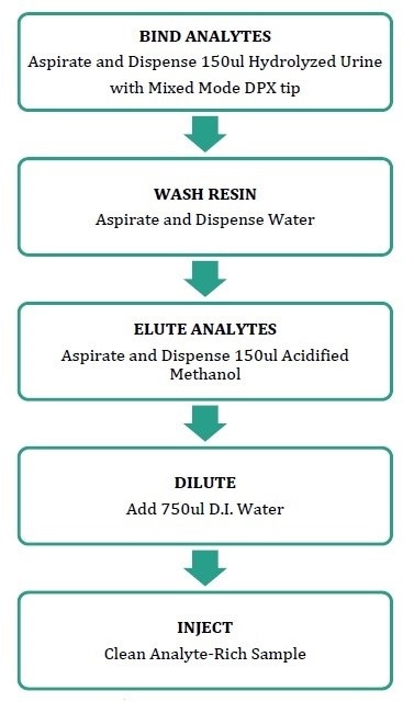 The Integra system is loaded with well plates containing hydrolyzed urine samples. Then, pre-filled well pates for elution solvent and water wash are mounted into the Integra, and 30% methanol is aspirated from a solvent reservoir to condition the DPX tips.