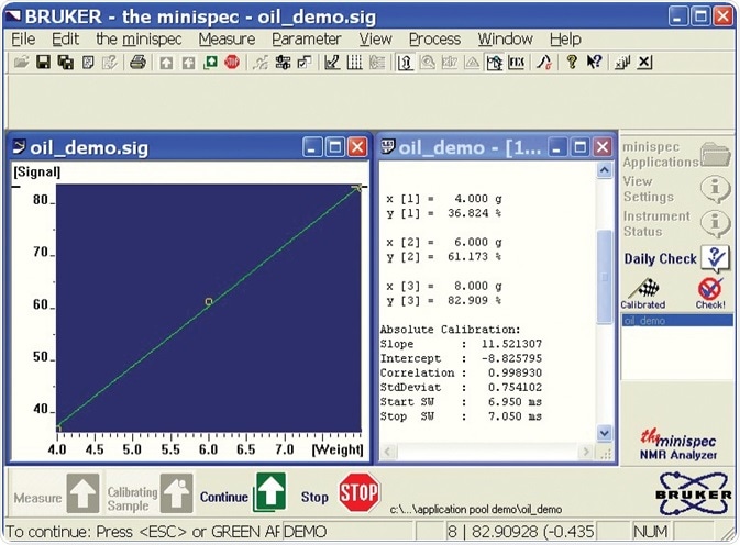 • Detection limit: The minispec can be used to measure fat as low as a few milligrams. Detection can be achieved on low moisture content samples and relies on sample volume, magnetic field strength, measurement time, probe used, etc.