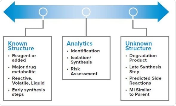 Discovering “things that are added” is relatively easier than “things that may have formed.” Both need an initial evaluation. For example, knowledge of addition of an acid chloride at step 3 of the synthesis, can suggest a straightforward approach for analysis of sample, and extrapolation of the detection characteristics. The available toxicological data may also simplify the analysis.