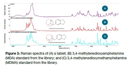 This may be seen in Figure 3 which displays the Raman spectra of a tablet, 3,4-methylenedioxyamphetamine (MDA) and also 3,4-methylenedioxymethamphetamine (MDMA) reference standards drawn from the library. As the inset shows, there is only a slight structural difference between MDA and MDMA but the two are clearly distinguished by their Raman spectra. The tablet of unknown substance was, in this case, clearly seen to be MDA with its score matching MDA at 83 compared to 66 with MDMA.