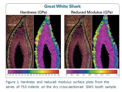In the present study, nanoindentation tests were carried out on a single Piranha and a single Great White Shark (GWS) tooth sample, using a Hysitron® TriboIndenter® device. The tooth samples were first embedded in epoxy before being polished into a smooth cross-sectional surface to prepare them for testing.