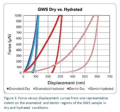 The two different samples were alike in showing an approximately five-fold increase in hardness from the inner dentin at 0.7 GPa to the outer enameloid region at about 4.1 GPa, the latter being the protective layer. The modulus showed the same trend from about 21 GPa to 85 GPa from the inner dentin to enameloid layer. Figure 2 shows the surface plots showing the results of indentation of each of the samples. When these are analyzed it provides a wealth of information about the mechanical properties of these marine teeth samples. It reveals that hydration reduces the hardness and modulus of the dentin but not the enameloid, due to the high mineralization and low percentage of water and organic components. Figure 3 shows some force-displacement curves from the GWS indentation test to represent these changes in the mechanical characteristics of different regions, depending on the degree of hydration. Figure 4 presents a direct comparison of indentation in dry versus hydrated conditions.