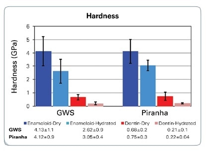In the current experiment, the nanoindentation trends were comparable to previous experiments to measure the microhardness on other samples. Enameloid and dentin parts of a GWS showed microhardness to be 1.56 and 0.31 GPa, respectively, under dry testing conditions, using indents of approximately 60 µm at about 200 µm distance between them. On the other hand, the size of the nanohardness indents was about 2 µm with 75 µm distance between them.