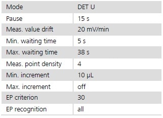 25 mL of the filtrate is placed into a 100 mL beaker and made up to 60 mL with ethanol. The solution is titrated with c(HClO4) = 0.1 mol/L in acetic acid until the first equivalence point is passed.