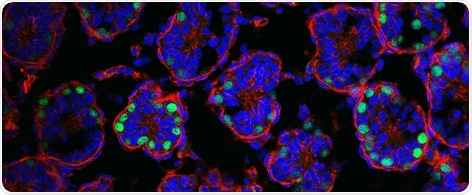 P6 CD-1 testis stained with anti-DAZL primary antibody (ab34139) and ab150081 goat anti-rabbit AlexaFluor® 488 secondary antibody (green). Phalloidin-594 was used to label F-actin (red), and DAPI was used to label nuclei (blue).