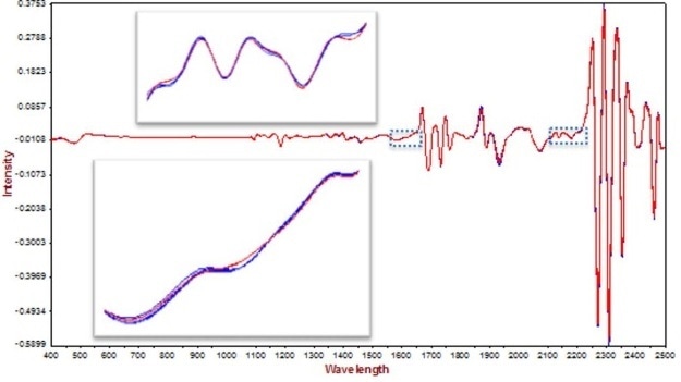 On a DS2500 analyzer, spectra were obtained (see Figure 1) over the entire wavelength range between 400 nm and 2500 nm in transflection mode. This transfection mode operates in such way that the light traversing the sample reflects through the gold reflector back into the detector. The Vision Air Complete software was used to acquire data and develop the quantification method.