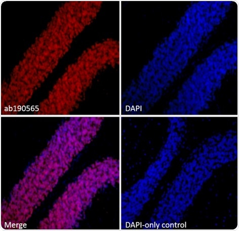 Immunohistochemistry of formalin-fixed paraffin-embedded rat cerebellum tissue sections stained with anti-NeuN [EPR12763] – neuronal marker (Alexa Fluor® 647) (ab190565). DAPI-only control is from another section and controls for tissue autofluorescence.