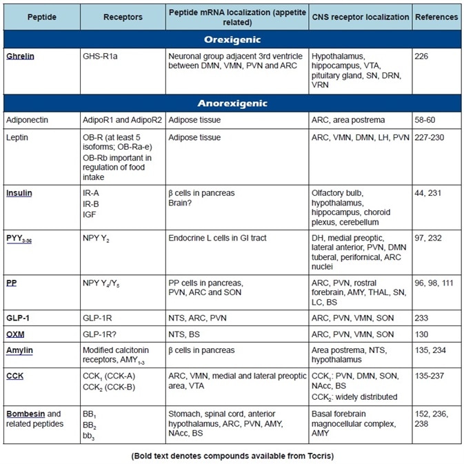 Table 1b. Peripheral appetite regulatory peptides: receptor classification, peptide, and receptor localization.