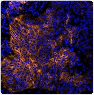 Figure 4. Detection of human PD-L1 (orange) in FFPE lung carcinoma by IHC-IF (pseudo color). Antibody: Rabbit anti-PD-L1 recombinant monoclonal [BLR020E] (A700-020). Secondary: DyLight® 594-conjugated goat anti-rabbit IgG (A120-201D4). Counterstain: DAPI (blue). Image Credit: Bethyl Laboratories Inc.